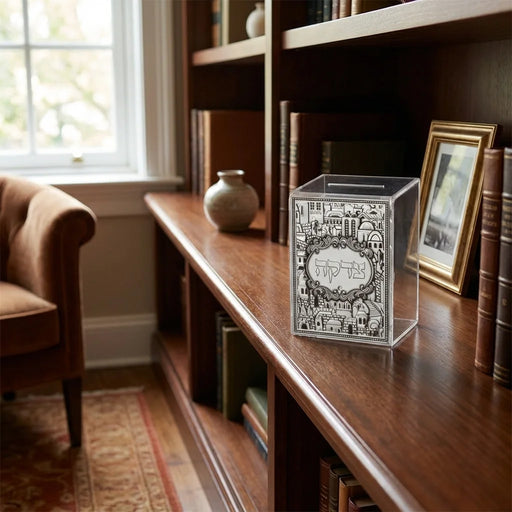 קופת צדקה פרספקס שקופה עם פלקטה דגם "ירושלים". פרטי המוצר: רוחב: 7.5 ס"מעומק: 7.3 ס"מגובה: 11.5 ס"מחומר: פרספקסצבע: שקוף חור לתליה על הקיר