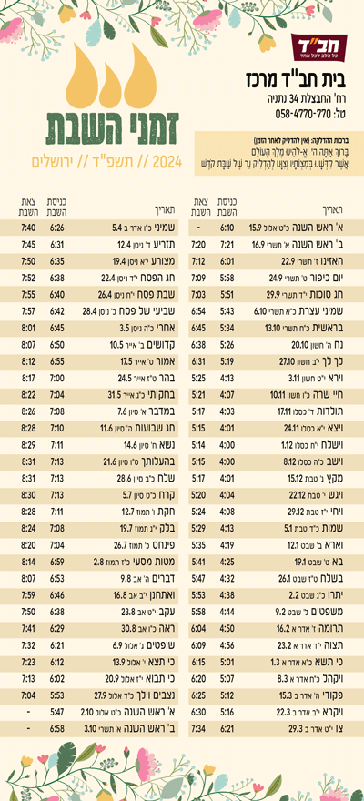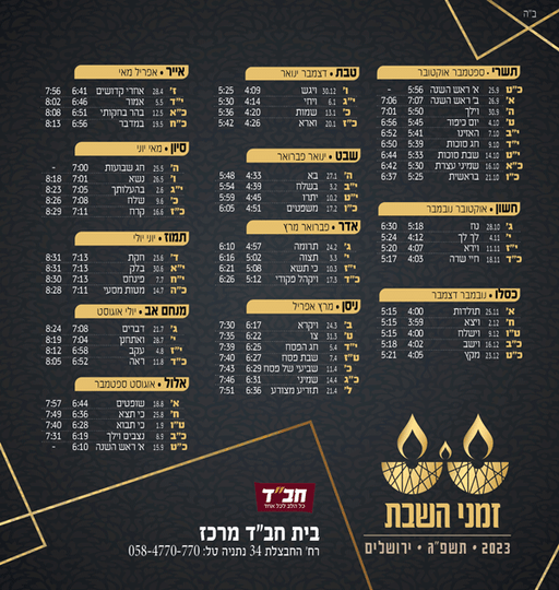 פרטים מלאיםלוח שנה מרהיב לשנת תשפ"ו, עם זמני הדלקת הנרות בשבתות וחגים - מותאם אישית לפי אזור החלוקה שלכם. מתאים מאוד לחלוקה על ידי בתי חב"ד, מוסדות וארגונים. ...