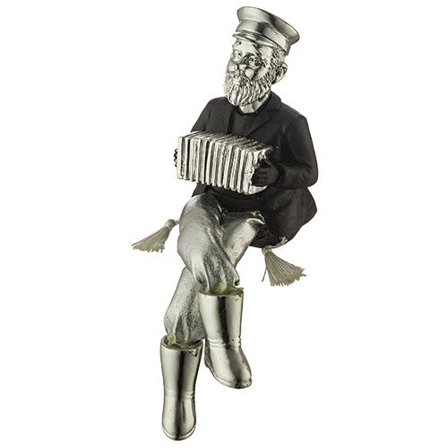 ליצן יושב מפוליריזן מוכסף עם רגלי בד מנגן בגיטר. חומר: פולירזיןצבע: כסף/צבעוניאורך בישיבה: 12 ס"מ