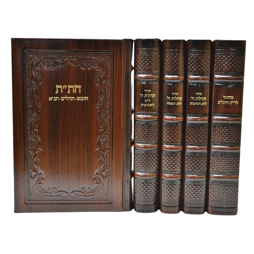 סט מחזור לראש השנה ויום הכיפורים, סידור לסוכות, סידור לפסח, סידור לחג השבועות וחת"ת גדול בכריכת עור מהודרת.מידות: גובה: 24 ס”מרוחב: 17 ס”מ