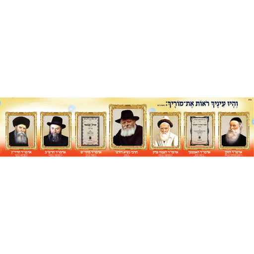 פרטים מלאיםשלט מרהיב מודפס על שמשונית עמידה וטבעות, עם תמונות שבעת רבותינו נשיאינו אדמו"רי חב"ד, והכיתוב "והיו עיניך רואות את מוריך". מגיע במגוון גדלים לשימוש...